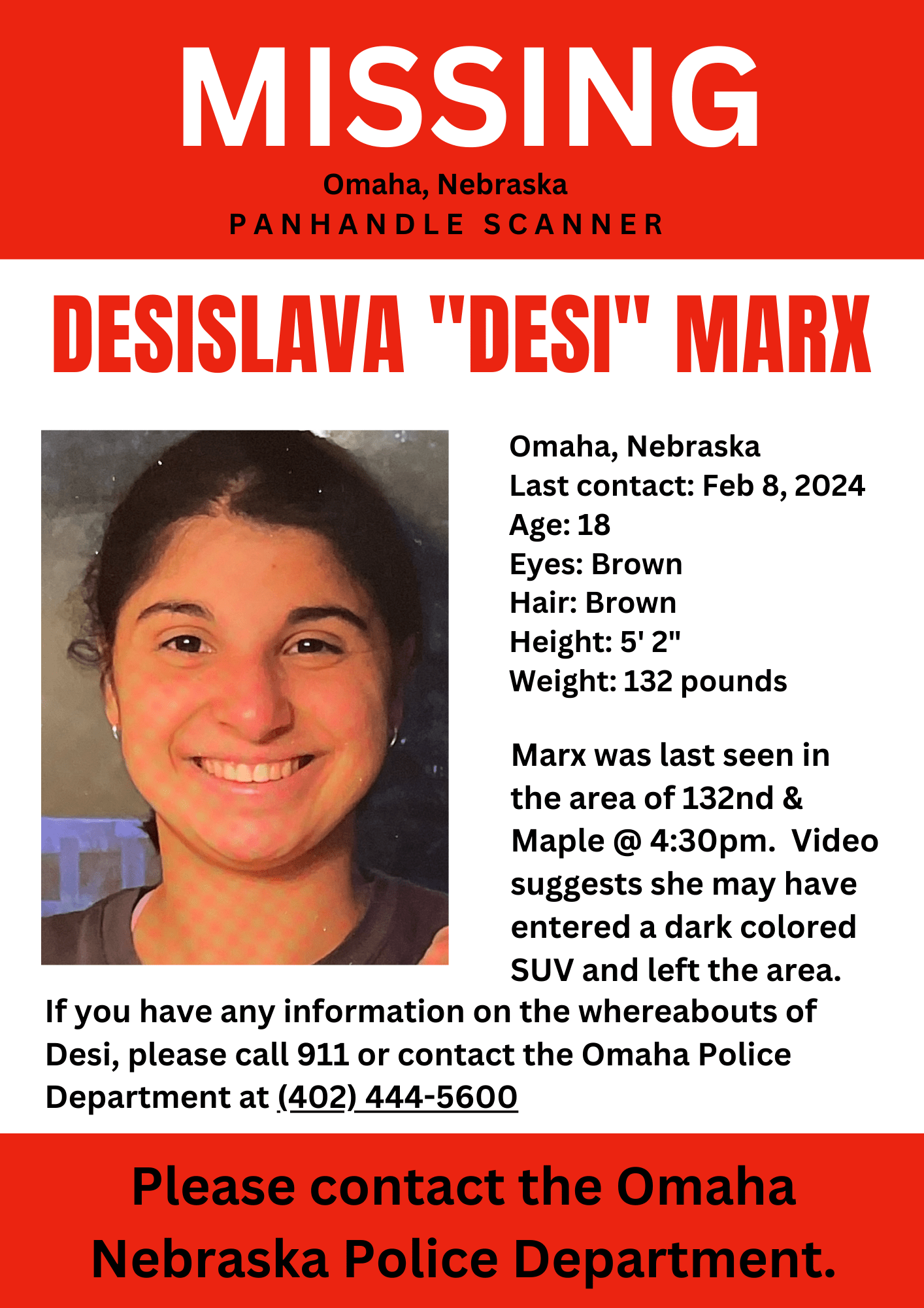 Omaha Police Department is seeking help locating a missing 18 y.o. female, Desislava “Desi” Marx. Marx was last seen in the area of 132nd & Maple @ 4:30pm Thursday. Video suggests she may have entered a dark colored SUV and left the area. Please call 911 with any information on her whereabouts.