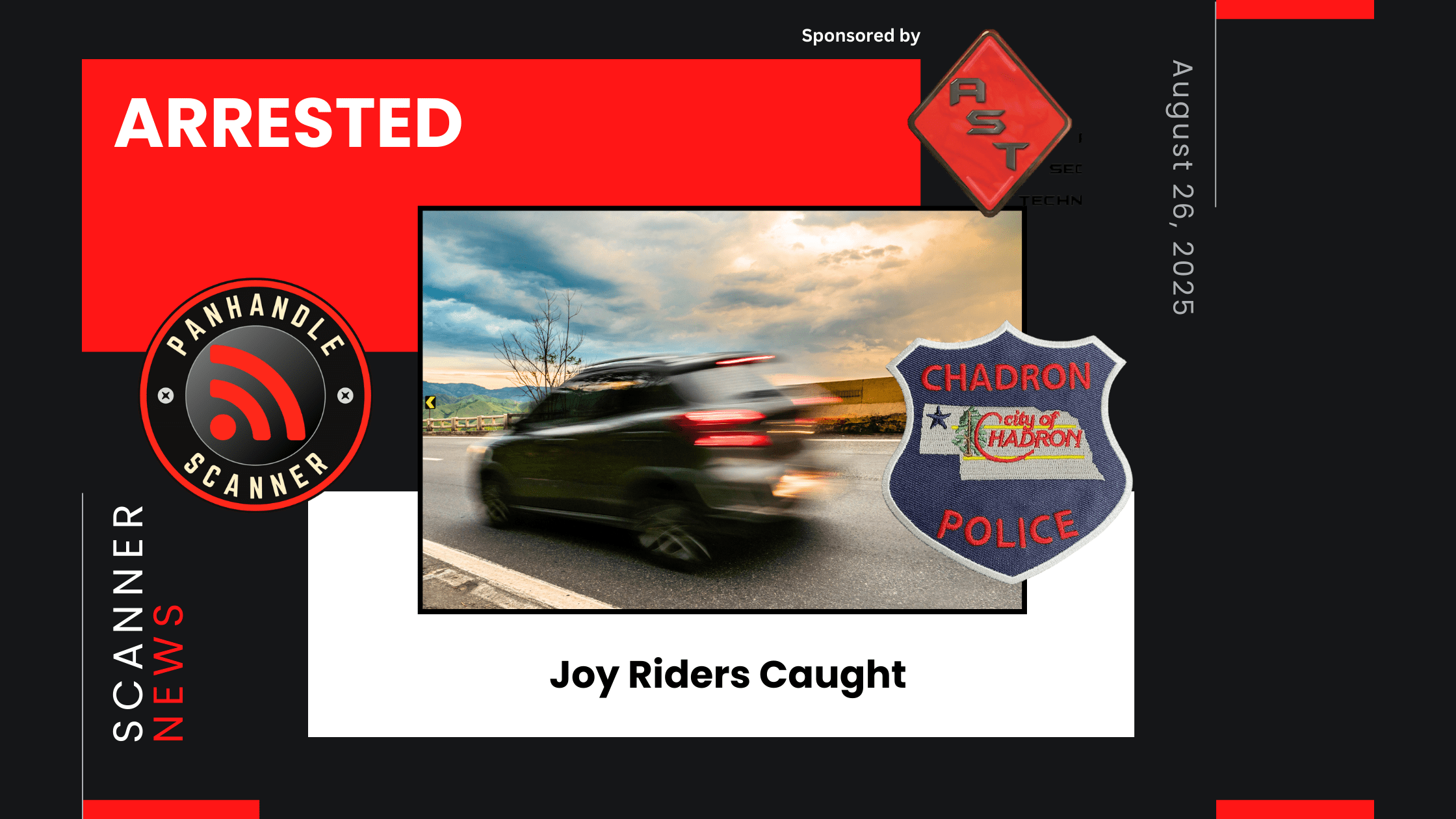 From Chadron PD: On Monday, Aug. 25, 2025 at 4:15 a.m., the Chadron Police Department was called to the area of Fourth Street and Pine Street for a motor vehicle accident. Upon arrival, Officers located a pickup truck in a field south of Fourth Street that had struck a metal structure/pole style barn. The pickup was present at the accident scene, with nobody around.